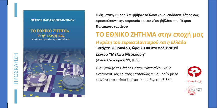 Με μεγάλη συμμετοχή και κυρίως αμείωτο ενδιαφέρον και συζήτηση έγινε η παρουσίαση του βιβλίου του Πέτρου Παπακωνσταντίνου “Το Εθνικό ζήτημα στην εποχή μας – Η κρίση του ευρωατλαντισμού και η Ελλάδα”. Ο συγγραφέας παρουσίασε τις βασικές ιδέες που αναπτύσσει στο βιβλίο του γύρω από το Εθνικό ζήτημα, την κρίση της παγκοσμιοποίησης, την αναζωπύρωση των εθνικισμών και τη θέση της Ελλάδας. Η συζήτηση που ακολούθησε επεκτάθηκε σε πολλές πλευρές του ζητήματος.